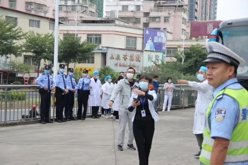 交警與誌願者共同指揮交通,保證大巴行駛暢通,醫院各人員順利轉移。