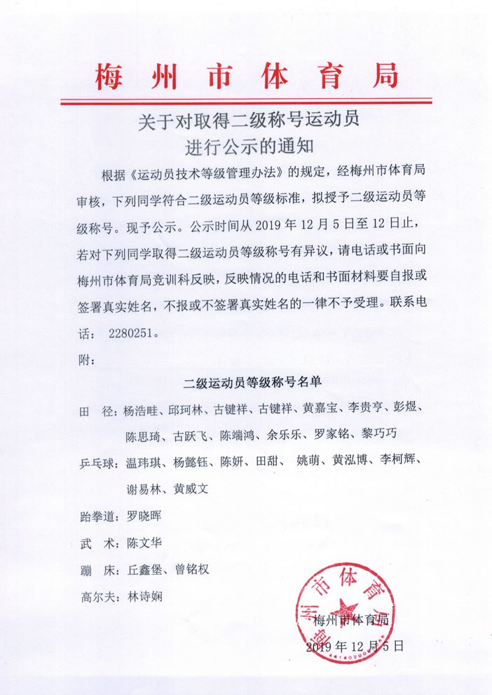 梅州市人民政府門戶網站 梅州市體育局 通知公告 對於取得二級稱號運動員進行公示的通知(2019-12)
