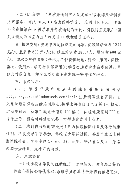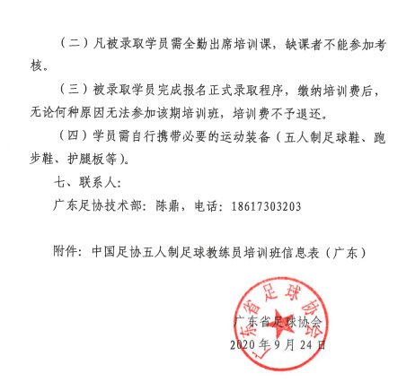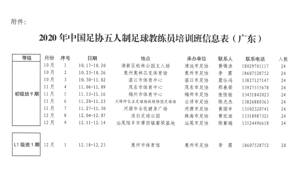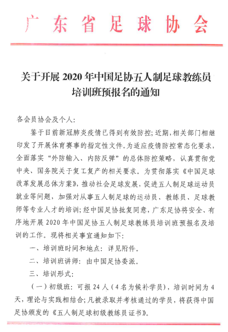 為促進五人製足球運動發展,培養優秀的五人製足球教練員,經中國足球協會、廣東省足球協會授權,由梅州市足球運動中心、梅州市足球協會主辦,擬於2020年11月在梅州市開展2020年中國足協五人製足球教練員培訓班。初級班考核通過者,可獲得中國足協頒發的《五人製足球初級教練員證書》;L1級班考核通過者,可獲得亞足聯/中國足協頒發的《室內五人製足球L1級教練員證書》。