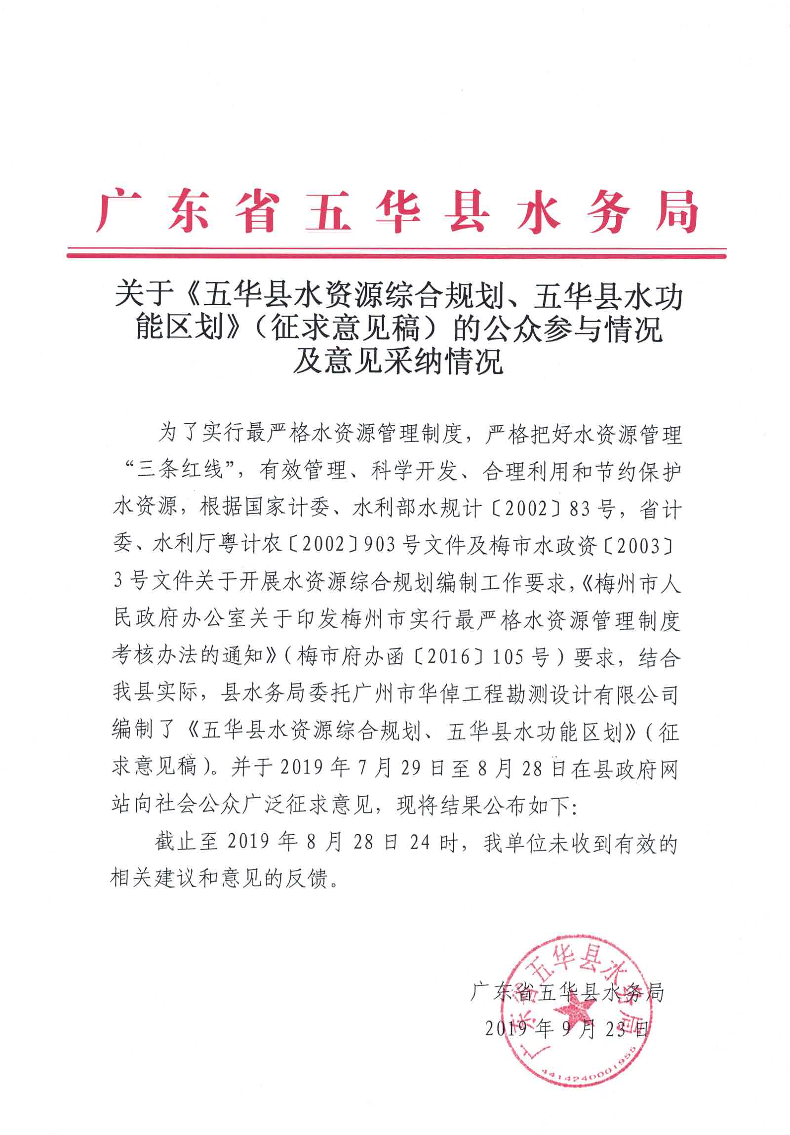 關於《五華縣水資源綜合規劃、五華縣水功能區劃(征求意見稿)》的公眾參與情況及意見采納情況