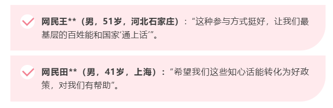 同時,我們還將經梳理後的部分建言轉給有關部門和地方。對於網民提出的一些建議,有關方麵表示已認真參考研究,下一步將持續完善政策措施。