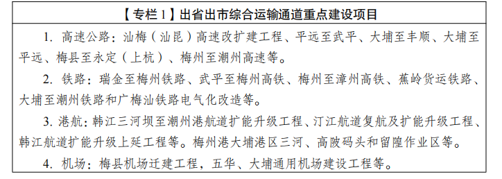 ——融灣入海的綜合大通道更加便捷通暢。高速公路網環射 相連密度更大,鐵路形成“米”字形網絡,航空運輸快速連接國 內外重點城市,梅州粵閩贛邊區域性綜合交通樞紐地位進一步夯 實,基本實現“1122”交通時空圈和“123”快貨物流圈。