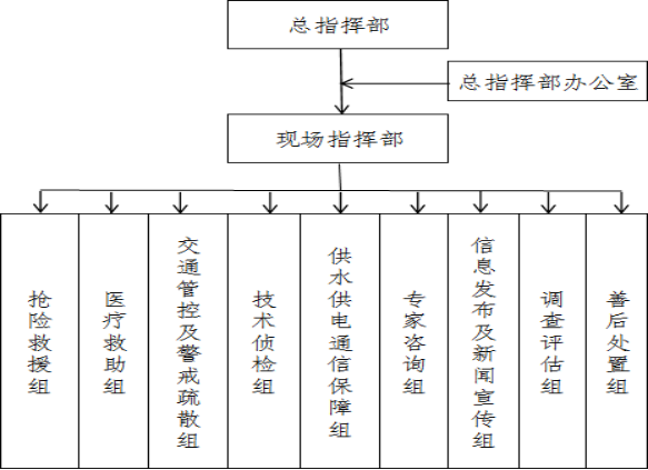 總指揮部是發生工貿行業一般生產安全事故且應急救援難度大或救援情況複雜,根據需要成立的臨時應急指揮機構。由縣政府分管應急管理工作的領導任總指揮,縣政府辦公室協調應急管理工作的副主任和縣應急管理局、縣消防救援大隊、事故發生地的鎮(場)主要領導任副總指揮,縣安委會有關成員單位及其它相關單位負責人為指揮部成員。