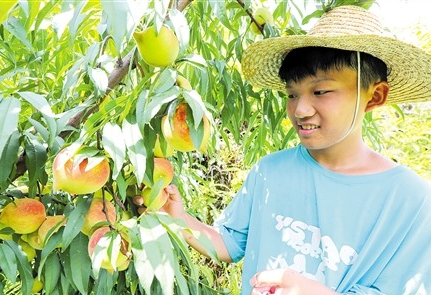 五華縣華城鎮葵富村鷹嘴桃基地正式開園,吸引了不少遊客前來體驗采摘樂趣。(圖片來源:梅州日報 高訊 攝)
