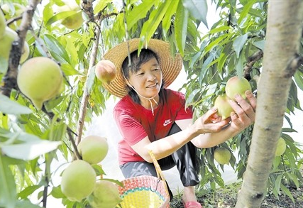 記者走進潭江村看到,一大片桃樹鬱鬱蔥蔥,翠綠泛紅的鷹嘴桃綴滿枝頭,與周邊金燦燦的稻田互相映襯,構成一幅悠然的山村野趣圖。一陣微風吹過,清新的果香味撲鼻而來,一個個飽滿的鷹嘴桃讓人垂涎欲滴。“聽說潭江的鷹嘴桃很好吃,我特意帶著家人從梅城過來采摘,這裏果然不錯,風景也好,鷹嘴桃也靚,讓人忍不住想要摘下一飽口福。”正在果園裏體驗采摘的市民李先生說道。