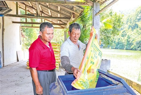 “產業村長”張偉君(左)和員工在給魚喂食。(圖片來源:梅州日報 吳騰江 攝)