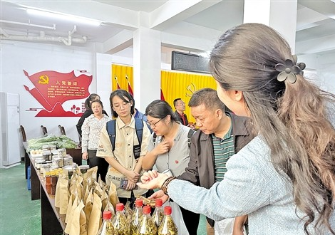“產業村長”王子瑜(右一)為前來上村村參觀的暨南大學教職工介紹梅州特色農產品。(圖片來源:梅州日報 張瑩娜 攝)
