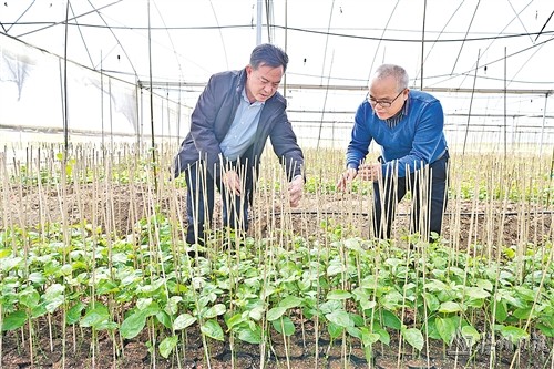 產業村長李展輝(左)在百香果育苗基地與黃沙村黨支部書記黎崇永交流幼苗培育經驗。
