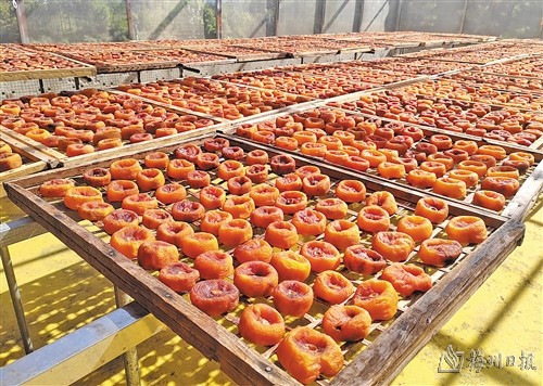在青崗村強興七目嶂公司柿子基地,記者看到,滿山的柿子樹上掛滿了紅彤彤的柿子,村民們帶著豐收的喜悅,手持特製竹竿或徒手把一個個“紅燈籠”摘下。隨後對柿子進行削皮、上架晾曬處理。在半個多月時間裏,經過捏心定型、下架、回潤、潮色、出霜等工序後,“大田柿花”這一國家地理標誌產品便製作完成。