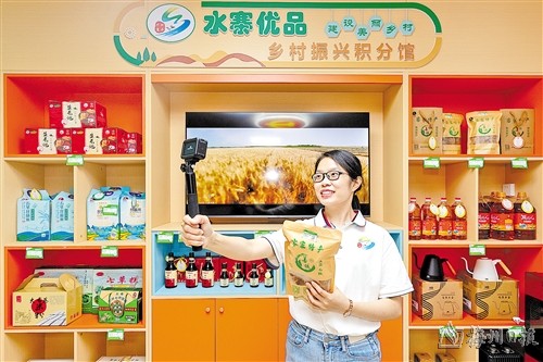 走進水寨優品·鄉村振興積分館,主播正通過直播推介該鎮特色農產品:“這是產自善坑村的五指毛桃,道地藥材,煲湯鮮美……這是我們梓皋片產業社區生產的絲苗米,顆粒飽滿,營養豐富……”