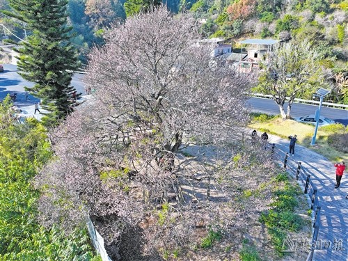 潮塘千年古梅迎冬綻放,滿樹繁花吸引不少市民前來觀賞和拍照。(圖片來源:梅州日報 高訊 攝)