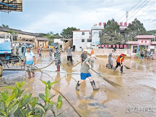 橋背村是梅縣區受災最嚴重的村莊之一。6月23日,在梅縣區委、區政府部署下,丙村鎮調配2台挖掘機、1輛鏟車以及高壓水槍等一批應急救援設備,由鎮幹部組成共40餘人的隊伍,分別前往鬆源圩鎮、橋背村等受災核心區支援清理工作。