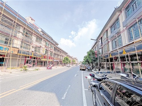 在留隍鎮新興路等地,道路兩旁的房屋已搭建好腳手架,工人們正在對房屋外立麵進行改造施工,一派繁忙景象。(王銳 攝)