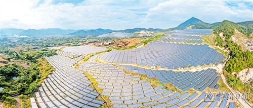 位於平遠縣東石鎮尖山礦區的平遠利天光伏發電項目現場,一排排光伏板向陽而列,形成一道獨特的風景線。(連誌城 攝)