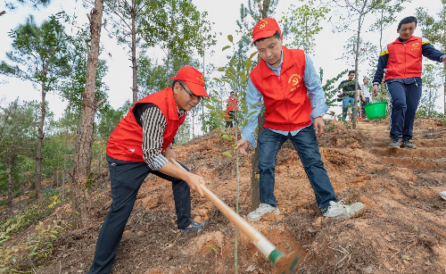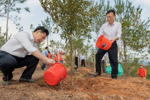 植樹現場,馬正勇、王暉、楊朝暉、王慶利等市領導,與廣大幹部職工、學生誌願者一起揮鍬鏟土、扶樹填坑、踏土夯苗、提桶澆水……每一道工序都做得一絲不苟,合力栽下一株株綠植。經過大家辛勤勞動,共種下紅椎、楠木等珍貴樹木和南山棗等特色樹種共計1628株。一棵棵新栽下的樹苗昂然挺立、錯落有致,靜待新芽吐綠。