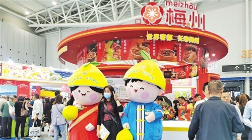 我市組織近70家梅州柚、客家炒綠、客家預製菜等企業參展。(李豔良 攝)