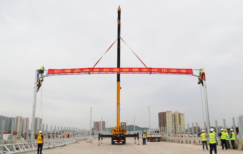 據悉,梅龍高鐵全線共設置硬橫梁25組,為保障首組硬橫梁順利架設,施工單位根據前期現場勘查定測數據,研究製定施工方案,同時對施工作業人員進行高空作業安全培訓和技術交底。施工過程中,作業人員規範操作,順利完成了起吊、對位、連接、緊固、落臂等工序,成功將長達21米的硬橫梁安裝固定在支柱上。