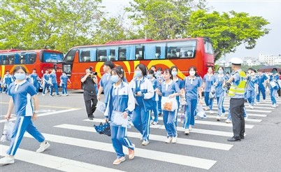 早上7時許,廣東梅縣外國語學校校園內外熱鬧非凡。約500名高一高二年級學生早早地排起長隊,喊著整齊劃一的口號,為高三考生加油壯行。在熱烈的掌聲和呐喊聲中,考生們陸續穿過送考隊伍,自信滿滿地坐上送考專用大巴前往考點,整個送考場麵壯觀而又激動人心。