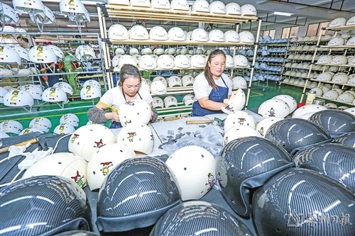 位於梅州綜保區的梅州勁越頭盔有限公司生產車間一景。(吳騰江 攝)
