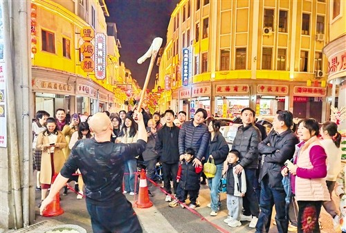 夜幕降臨,梅城老街張燈結彩,熱鬧非凡。舞龍獅、打糍粑、嚐美食……春節假期期間,“一家人”糍粑店的手藝人張繼財每天都在店內表演手工糍粑的製作過程,在他的賣力表演和音樂渲染下,前來購買糍粑的消費者總是裏三層外三層。“第一次到現場看打糍粑,覺得非常有意思,春節帶孩子到梅州走親訪友,感受濃濃的客家文化。”從潮汕自駕過來的遊客許昌茂表示,梅州年味濃厚,老街裝扮得特別喜慶,很有氛圍。