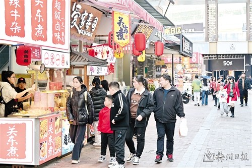 “老板,來一份仙人粄”“老板,來一份鬆口炸肉丸”……在梅縣區鬆口鎮火船碼頭,遊客們有序點餐,準備品嚐當地特色美食。經營各種特色小吃的店主利索地準備食盒打包,將一份份新鮮趕製的美食遞到遊客們手中。“早就聽說鬆口炸肉丸很好吃,我看到就立馬買來嚐一嚐。”來自潮州的遊客梁麗雲點讚說,炸肉丸很好吃,等行程結束後,她要再買點回去當手信,讓家裏人也嚐一嚐。無獨有偶,像鬆口古鎮這樣的場景在梅江區萬達廣場金街、江北老街等地以類似的方式呈現著,隨處可見市民和遊客手捧小吃,邊吃邊逛,盡情享受春節假期,感受世界客都濃濃的年味。