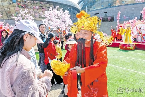 春節期間,不少景區開展送福活動,與遊客朋友熱鬧賀新春。(圖片來源:梅州日報 圖片均由連誌城攝)