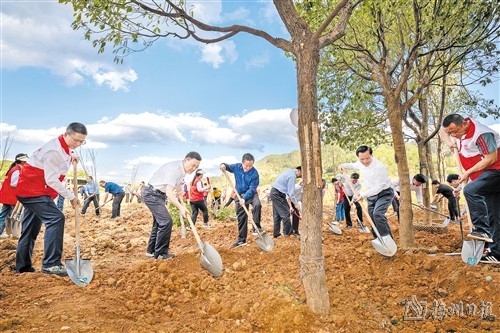 馬正勇與梅縣區和市直有關單位幹部職工一起在植樹活動現場種下一株株綠植。(連誌城 攝)