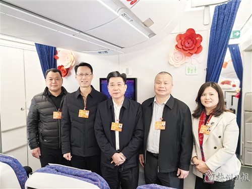 5位全國人大代表乘機出發赴京。左起:葉繼聯、張曉、王暉、鄒錦開、張春梅。