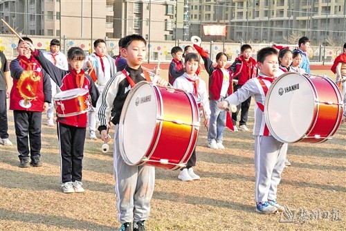 下午的課後服務時間,梅江區芹洋學校學生在操場上進行鼓號隊隊形、隊列等學習。(吳海清攝)