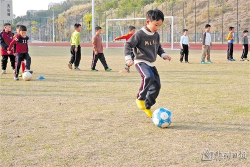 梅江區芹洋學校學生正參加足球班的課後服務活動。(吳海清攝)