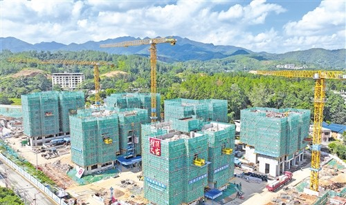 位於梅縣區鬆源鎮彩山村的梅縣深圳小鎮安居工程(一期)全麵封頂。(高訊 攝)