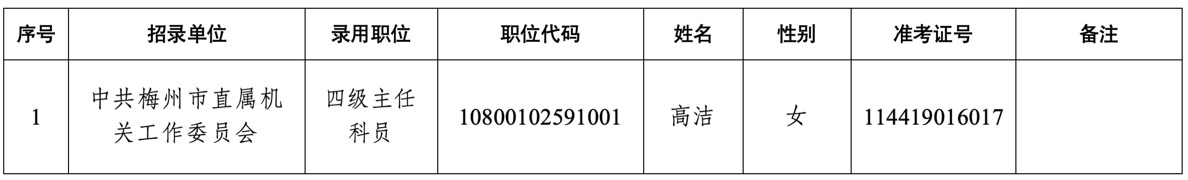 根據《中共廣東省委組織部、廣東省人力資源和社會保障廳關於印發<廣東省2025年度選調優秀大學畢業生資格審核、麵試和體檢等工作實施方案>的通知》(粵組通〔2025〕3號)、中共梅州市委組織部《關於做好我市2025年度選調優秀大學畢業生考察審批工作的通知》等文件要求,經過報名、推薦、資格初審、筆試、資格審核、麵試、體檢等程序,經市直機關工委委務會研究,確定高潔同誌為市直機關工委2025年度選調優秀大學畢業生擬錄用人員,現予以公示。公示時間:2025年3月28日至4月4日(5個工作日)。公示期間,歡迎群眾來電、來信、來訪反映情況。