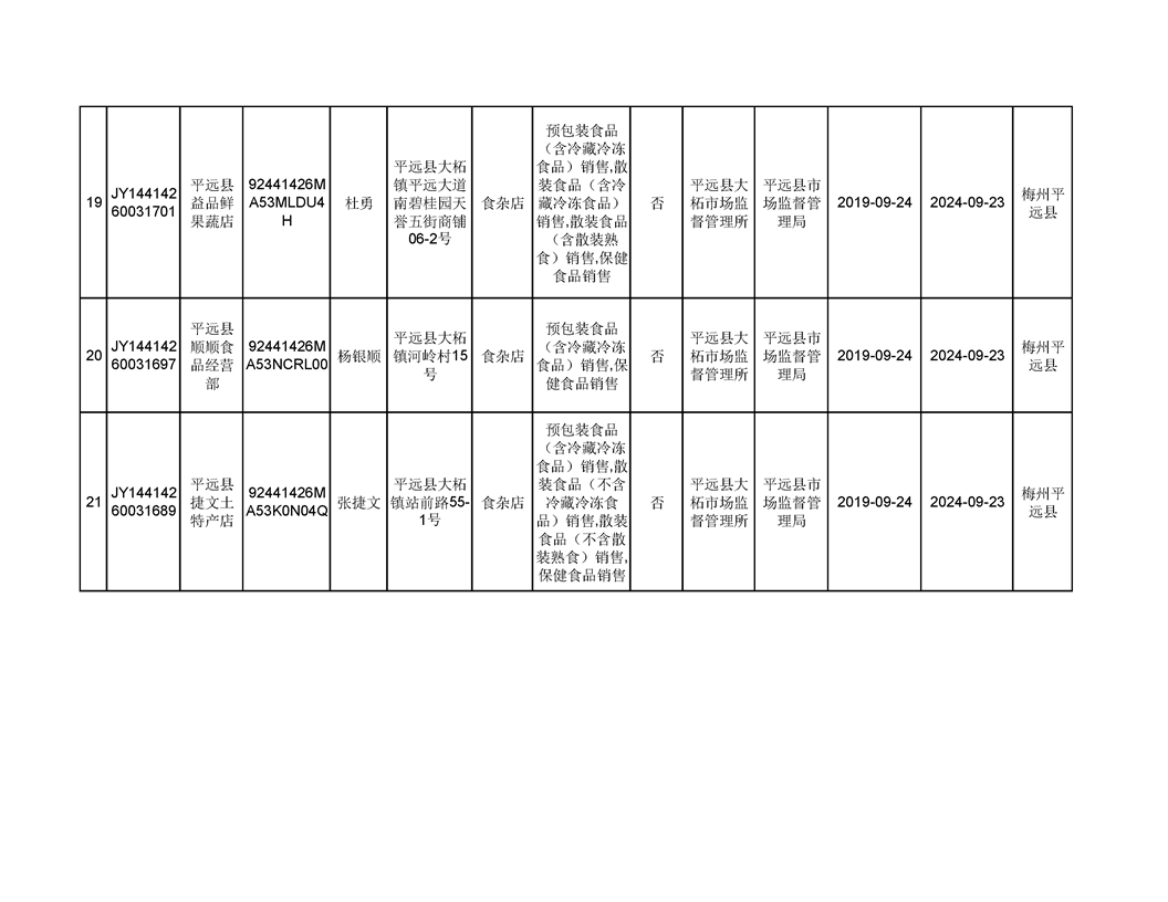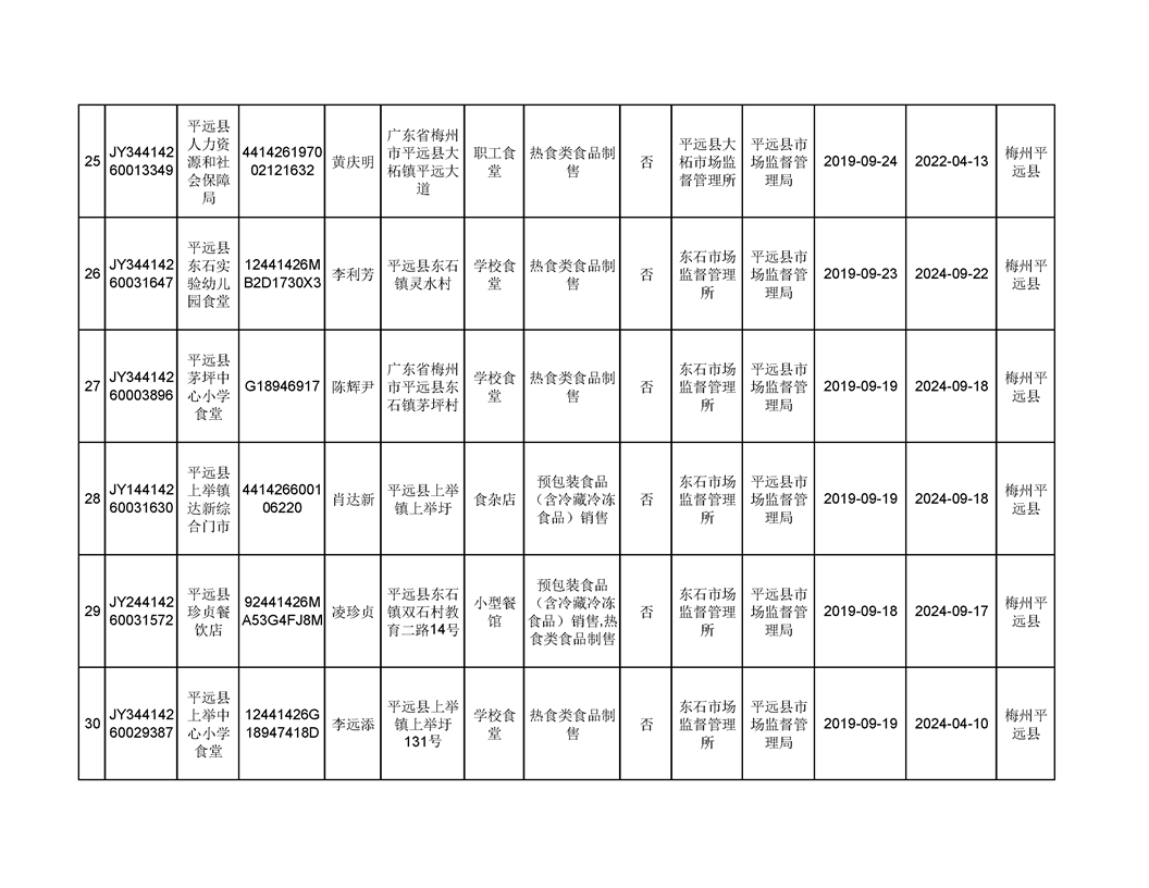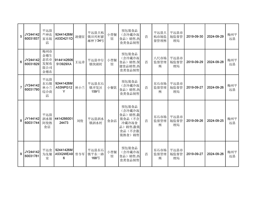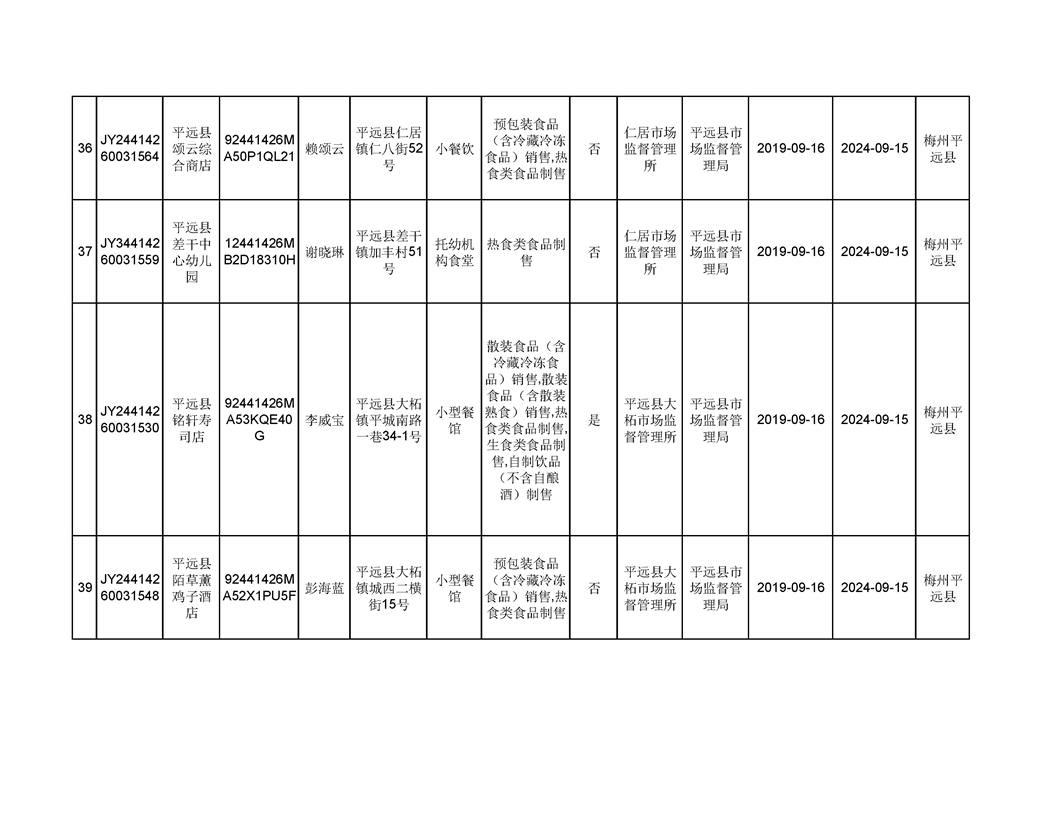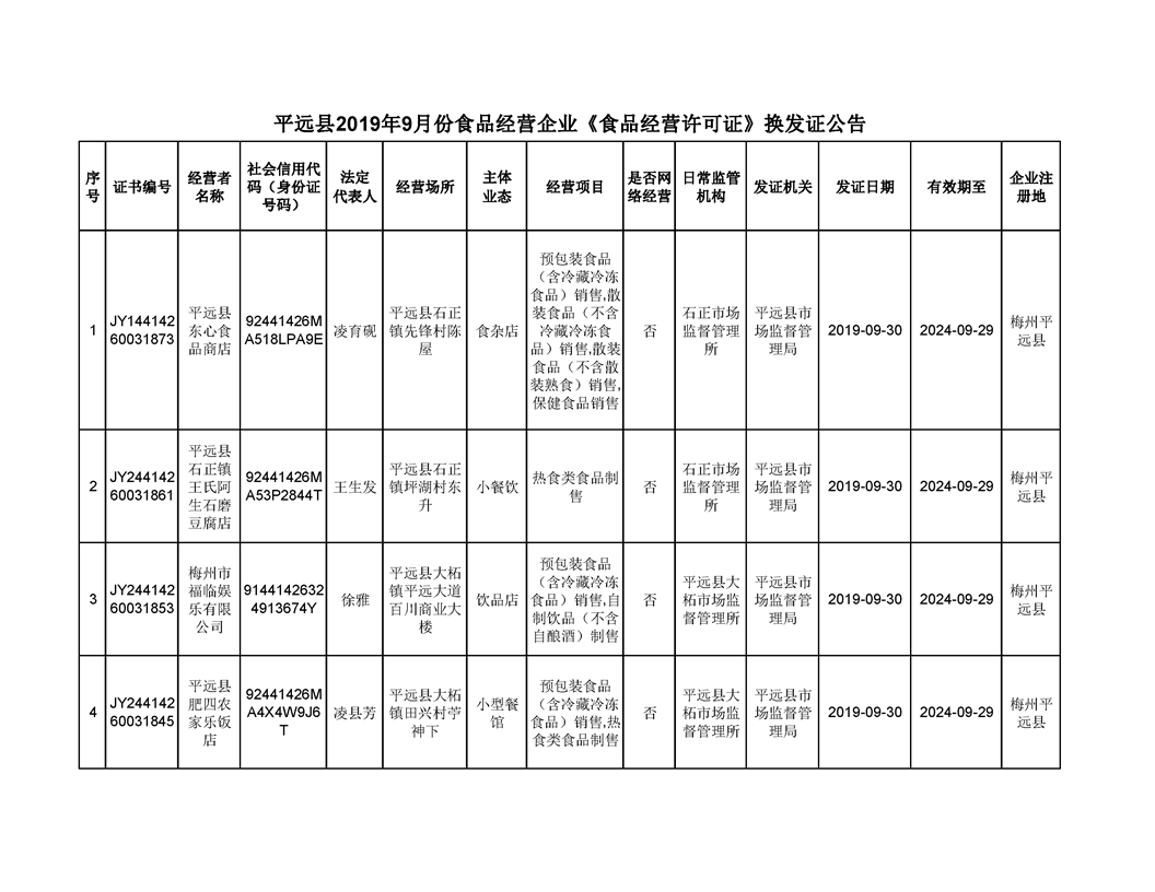 平遠縣2019年9月份食品經營企業《食品經營許可證》換發證公告