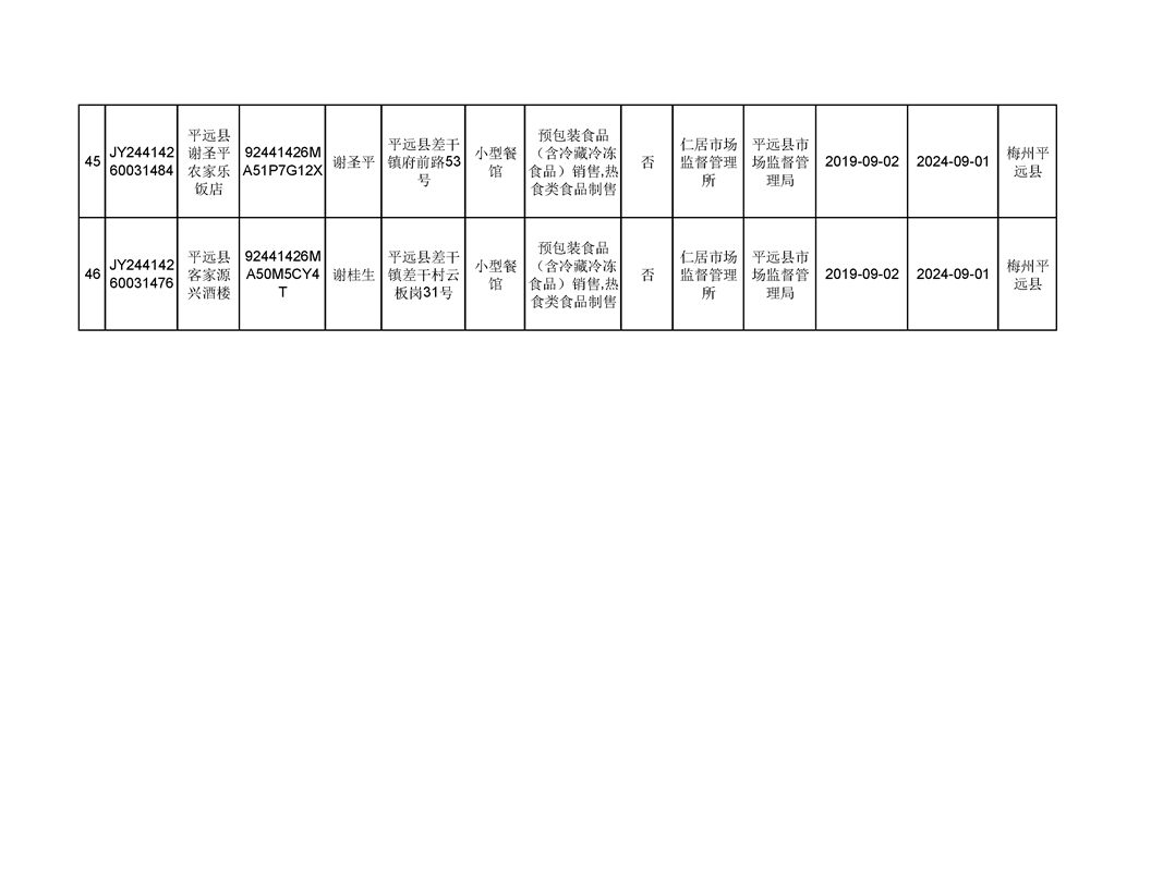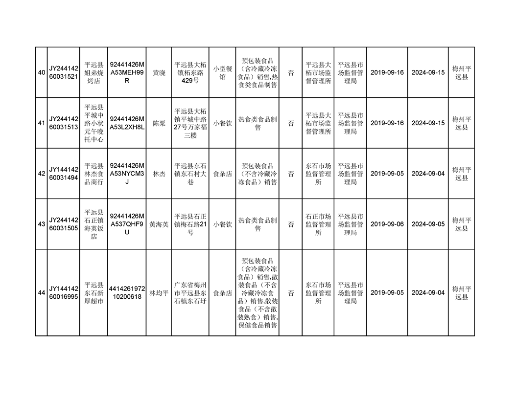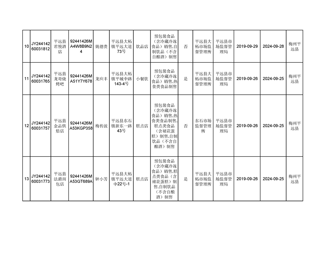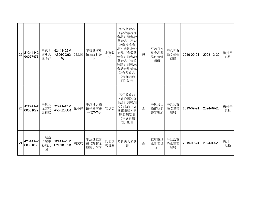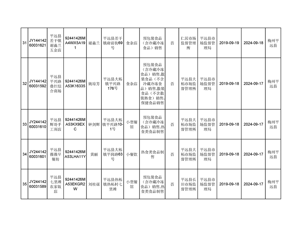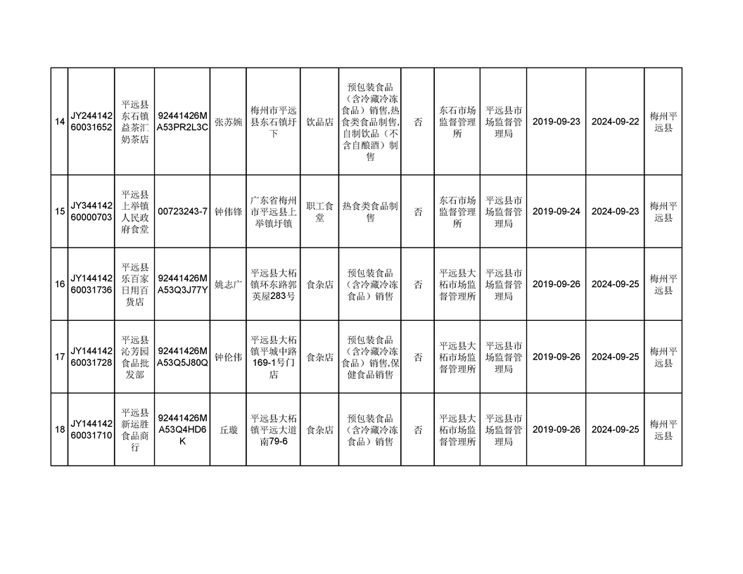 平遠縣2019年9月份食品經營企業《食品經營許可證》換發證公告