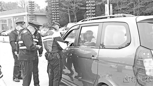 執勤人員正在檢查駕駛人員和車輛信息。(陳堅平 攝)