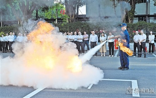 在演練中,梅江區江南消防救援站消防員對日常用火用電安全、火災預防和火情應急處置、火災疏散逃生時的注意事項等進行講解,並對比分析各類滅火器的成分和具體適用的火災類型,演示消防器材的正確使用方法。(記者 李盛華 熊傑 廖謹)