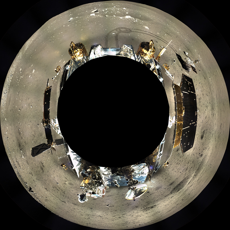 這是嫦娥三號地形地貌相機拍攝的著陸器周邊360°範圍的全景鑲嵌影像圖,采用方位投影方式表達(2013年12月17日至12月18日攝)。新華社發
