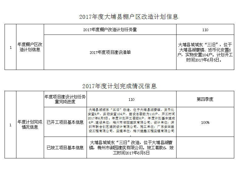 大埔縣2017年度棚戶區改造計劃信息(第四季度)