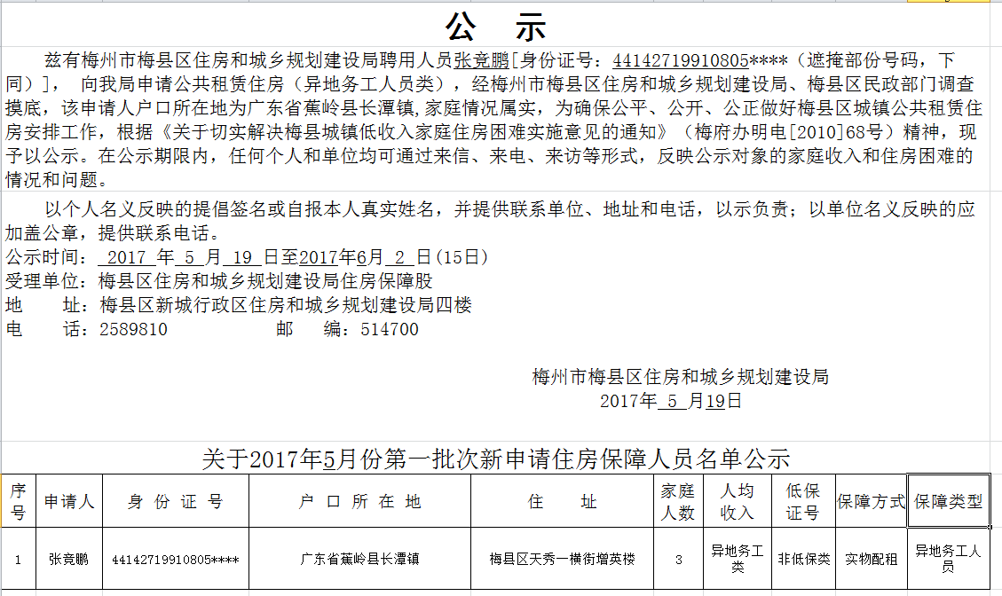 關於2017年5月份第一批次新申請住房保障人員名單公示