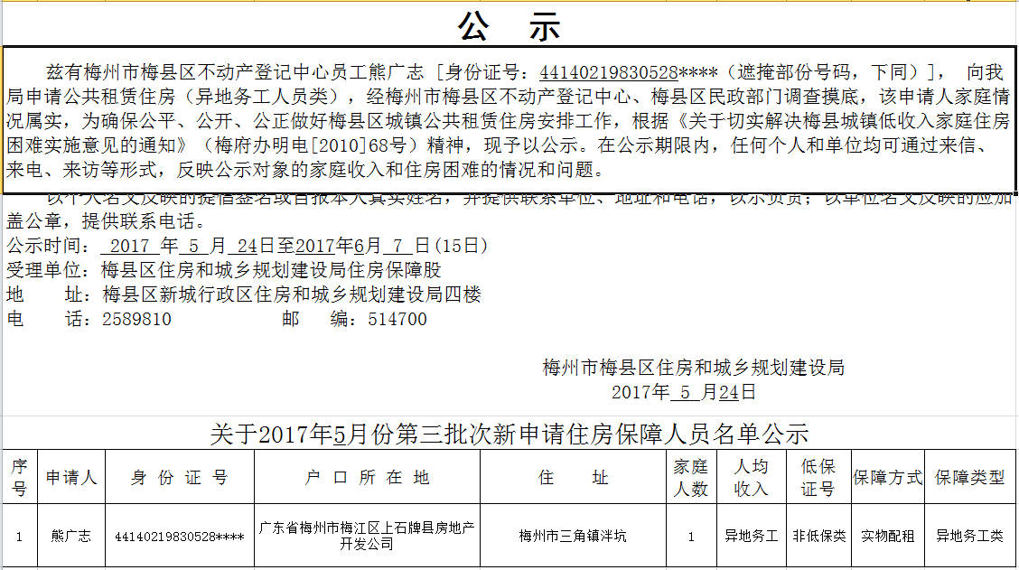 關於2017年5月份第三批次新申請住房保障人員名單公示