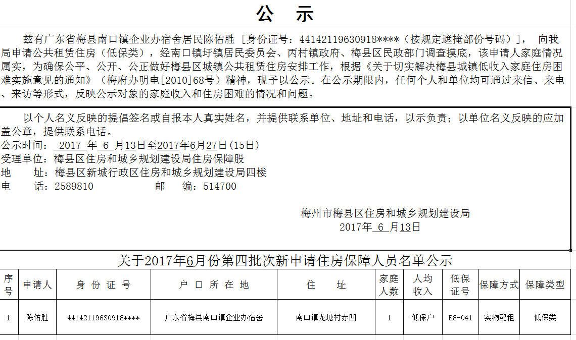 關於2017年6月份第四批次新申請住房保障人員名單公示
