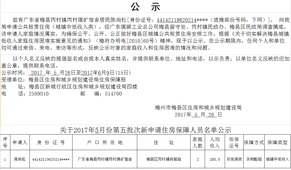 關於2017年5月份第五批次新申請住房保障人員名單公示