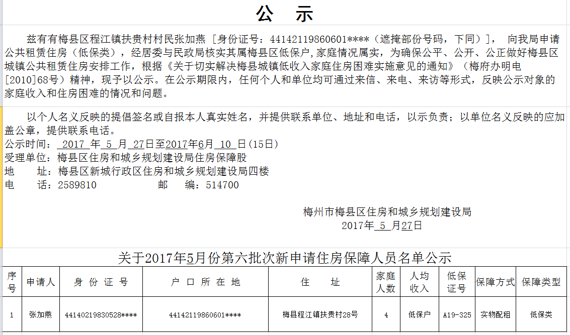 關於2017年5月份第六批次新申請住房保障人員名單公示