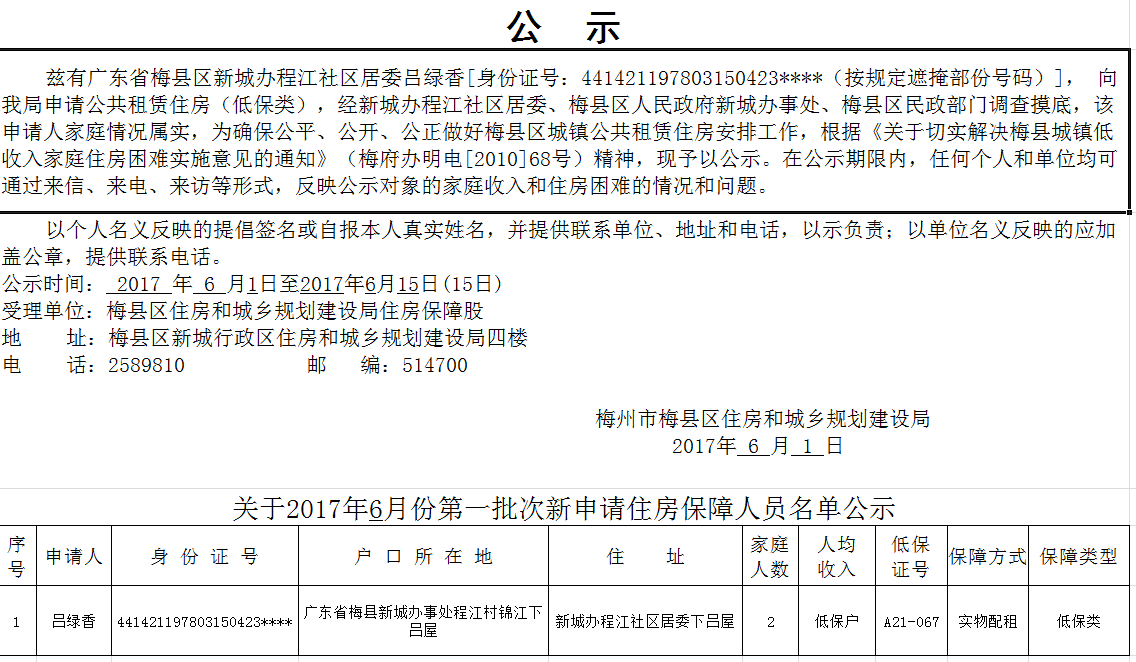 關於2017年6月份第一批次新申請住房保障人員名單公示