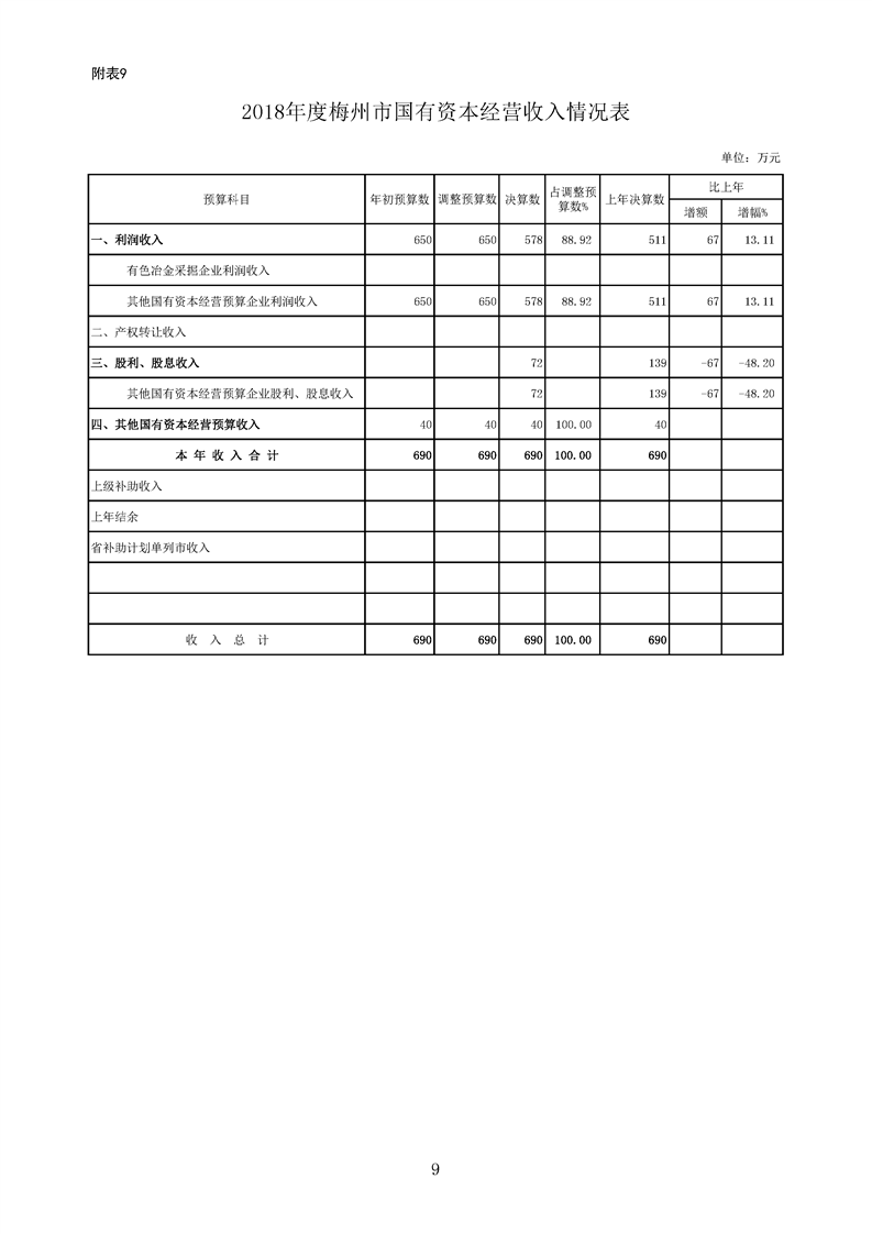 (附表9)2018年度梅州市國有資本經營收入情況表