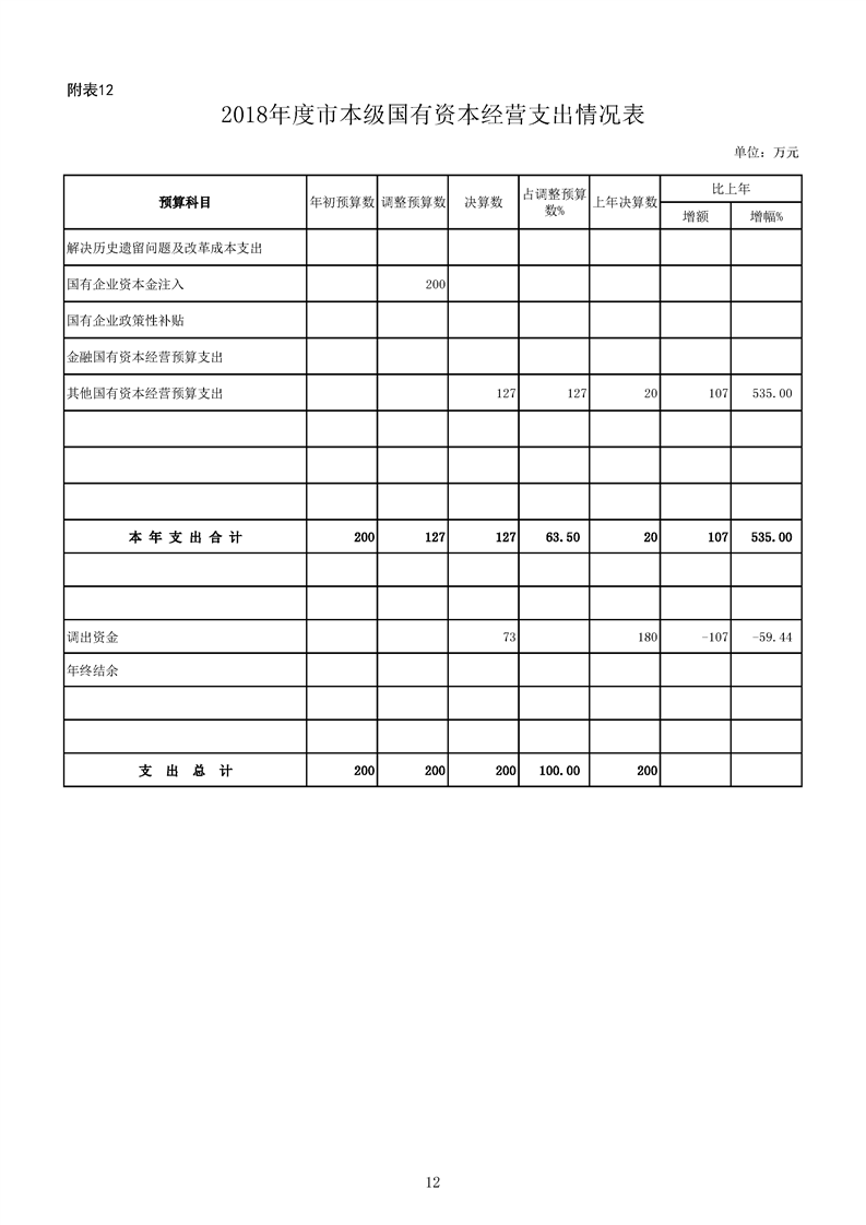 (附表12)2018年度市本級國有資本經營支出情況表