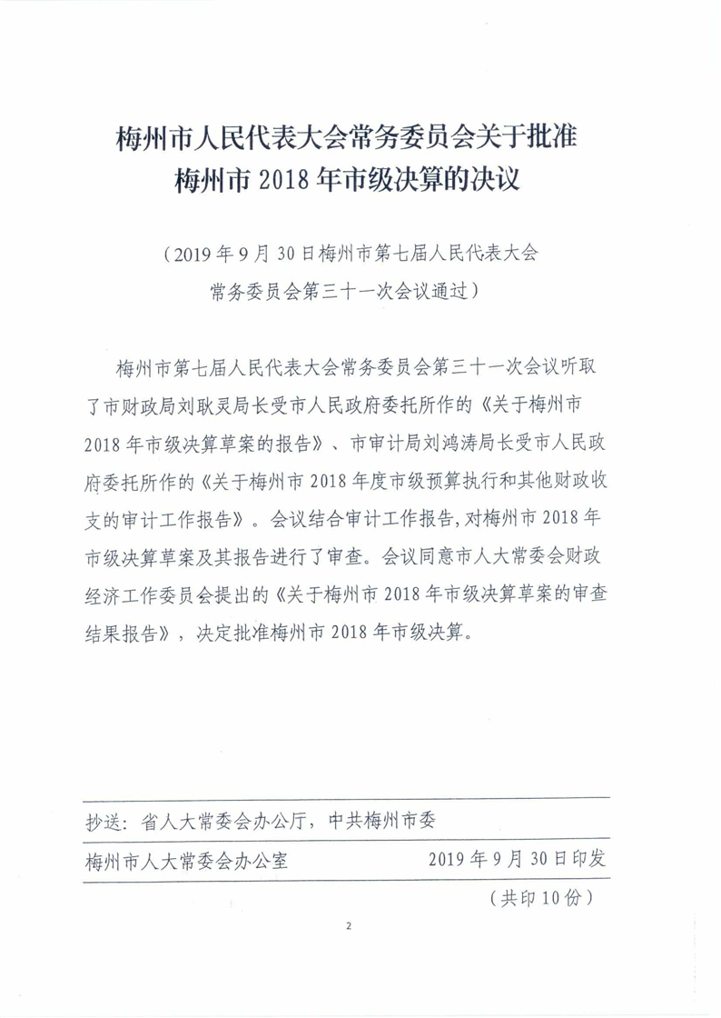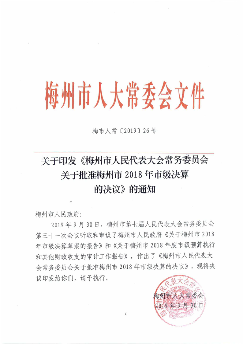 關於印發《梅州市人民代表大會常務委員會關於批準梅州市2018年市級決算的決議》的通知