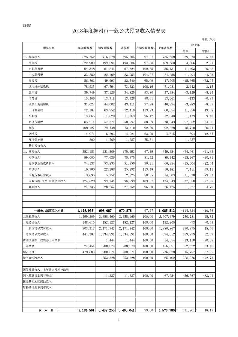 (附表1)2018年度梅州市一般公共預算收入情況表