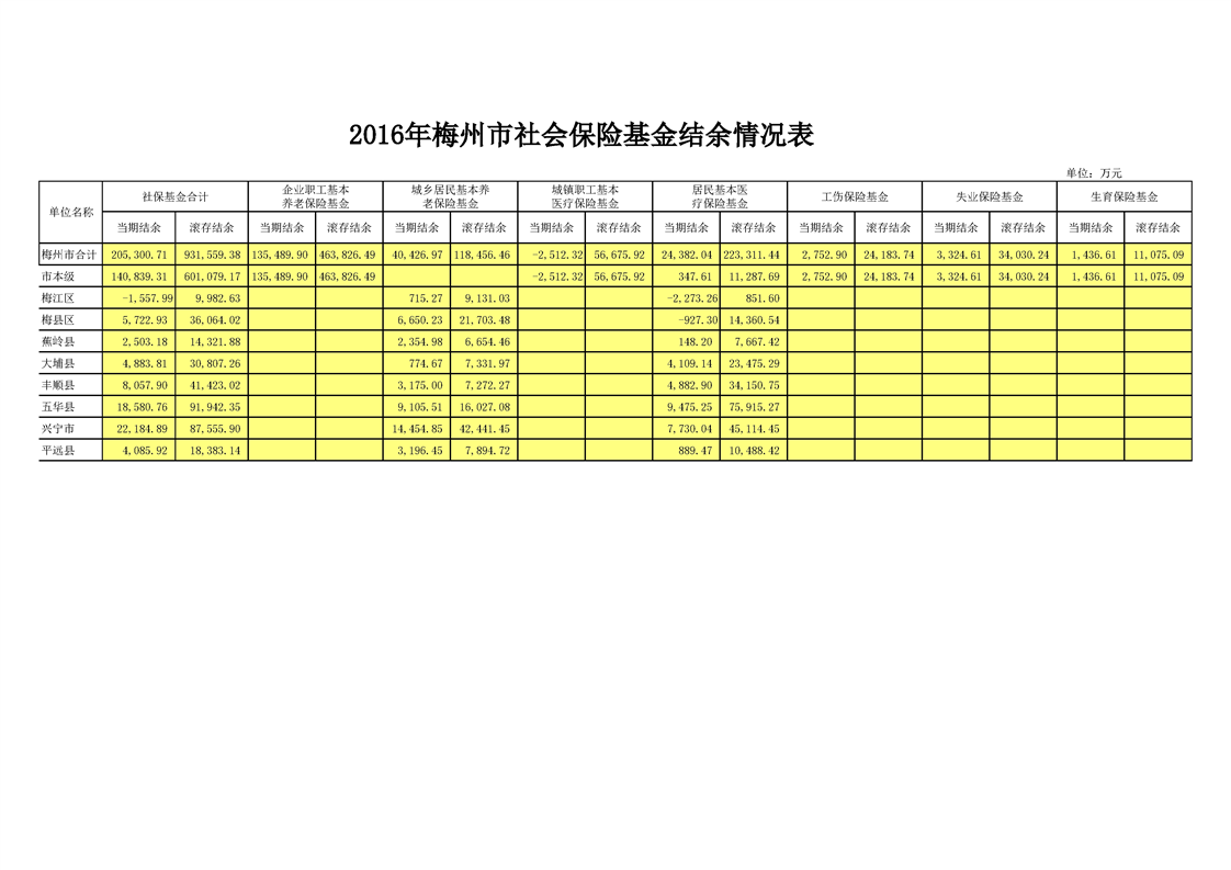 2016年梅州市社會保險基金結餘情況表