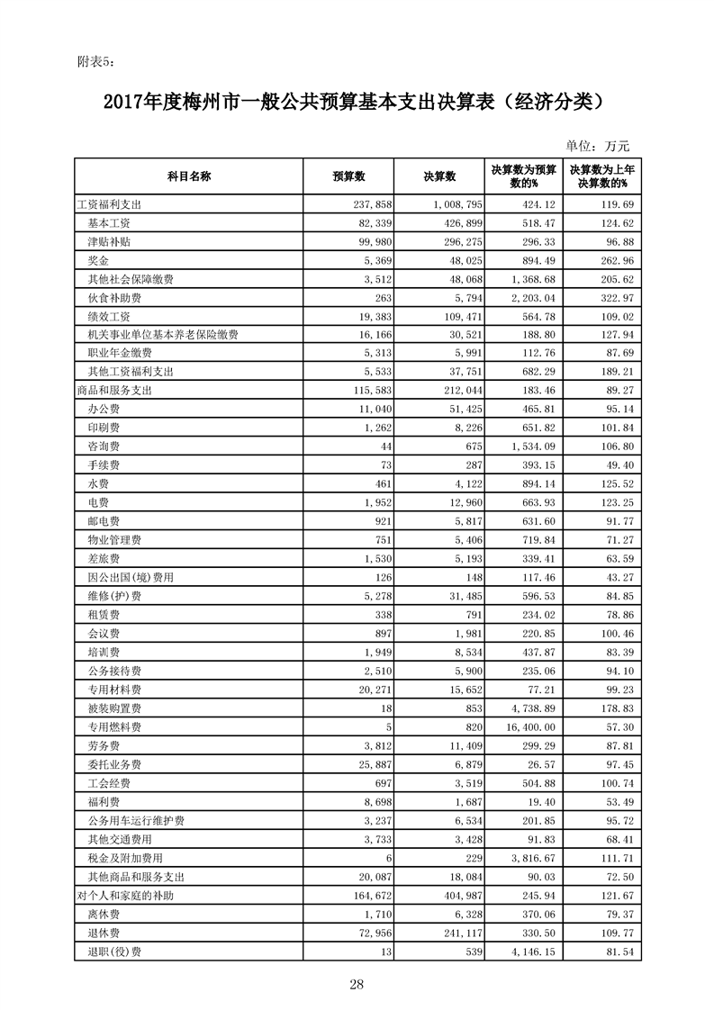 附表5:2017年度梅州市一般公共預算基本支出決算(經濟分類)